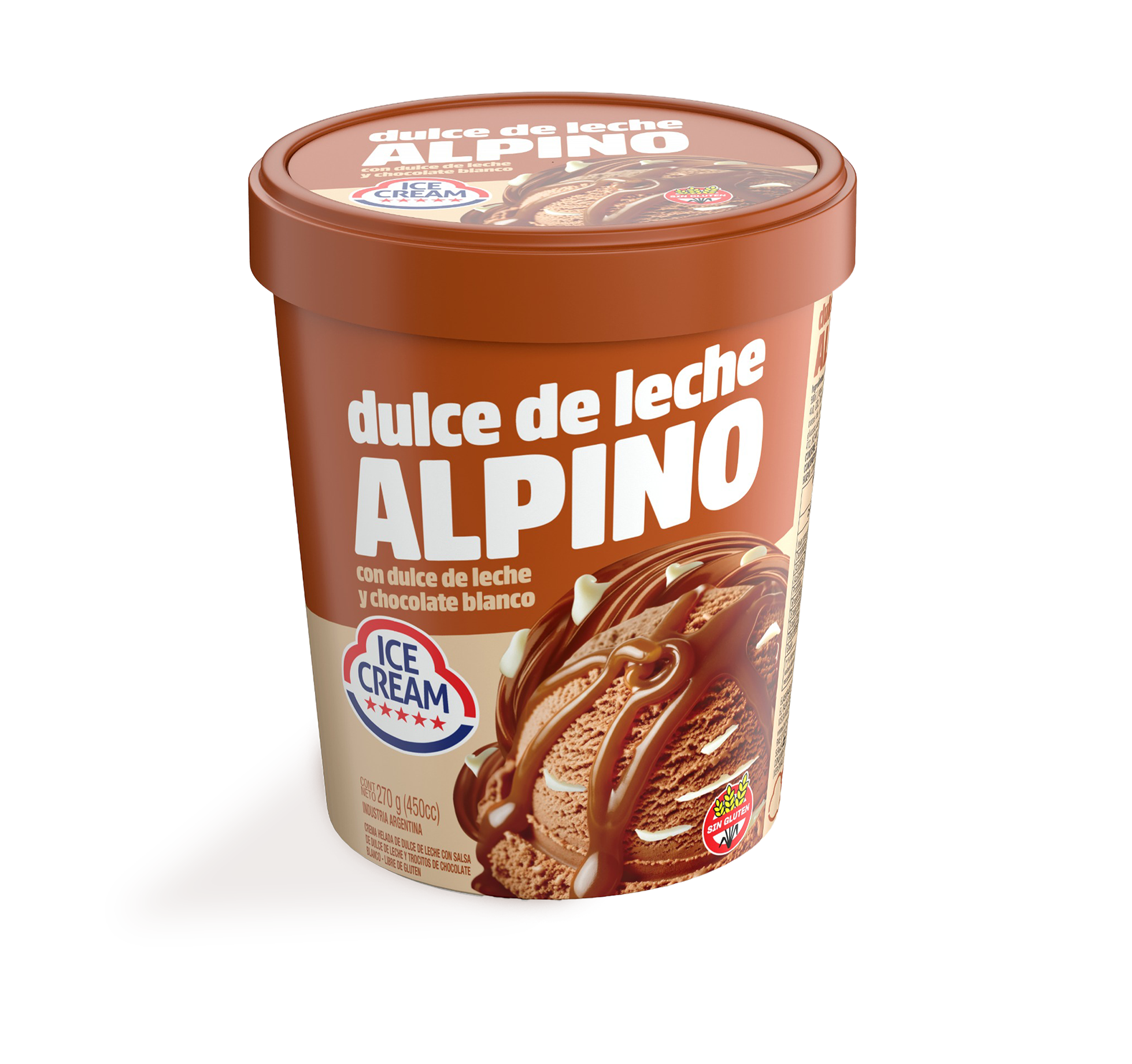 Dulce de leche alpino. Postre de crema helada de dulce de leche con dulce de leche y trocitos de chocolate blanco libre de gluten.